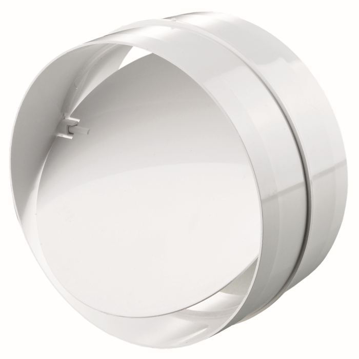 Łącznik kanałów okrągłych o rozmiarze fi 150 z zaworem zwrotnym do łączenia osiowego. Zawór dodatkowo zapobiega cofaniu się powietrza. Łatwy montaż bez specjalistycznych narzędzi „na wcisk”, nie wymaga spoiwa np. w postaci kleju, lekka konstrukcja, estetyczny wygląd.