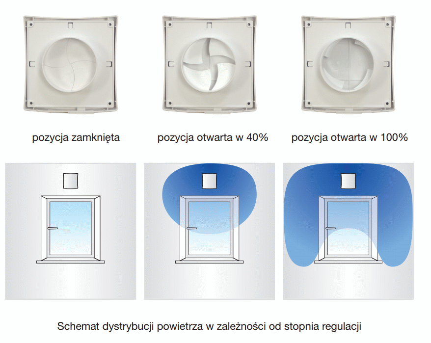 Specjalnie opracowana konstrukcja kratki wewnętrznej z możliwością regulacji przepływu powietrza gwarantuje subtelny nawiew i dystrybucję powietrza bez ryzyka podmuchów. Delikatne mieszanie się ciepłego i zimnego powietrza w sezonie zimowym zapobiega skraplaniu się nadmiaru wilgoci i zapewnia przyjazny klimat wewnątrz pomieszczenia.