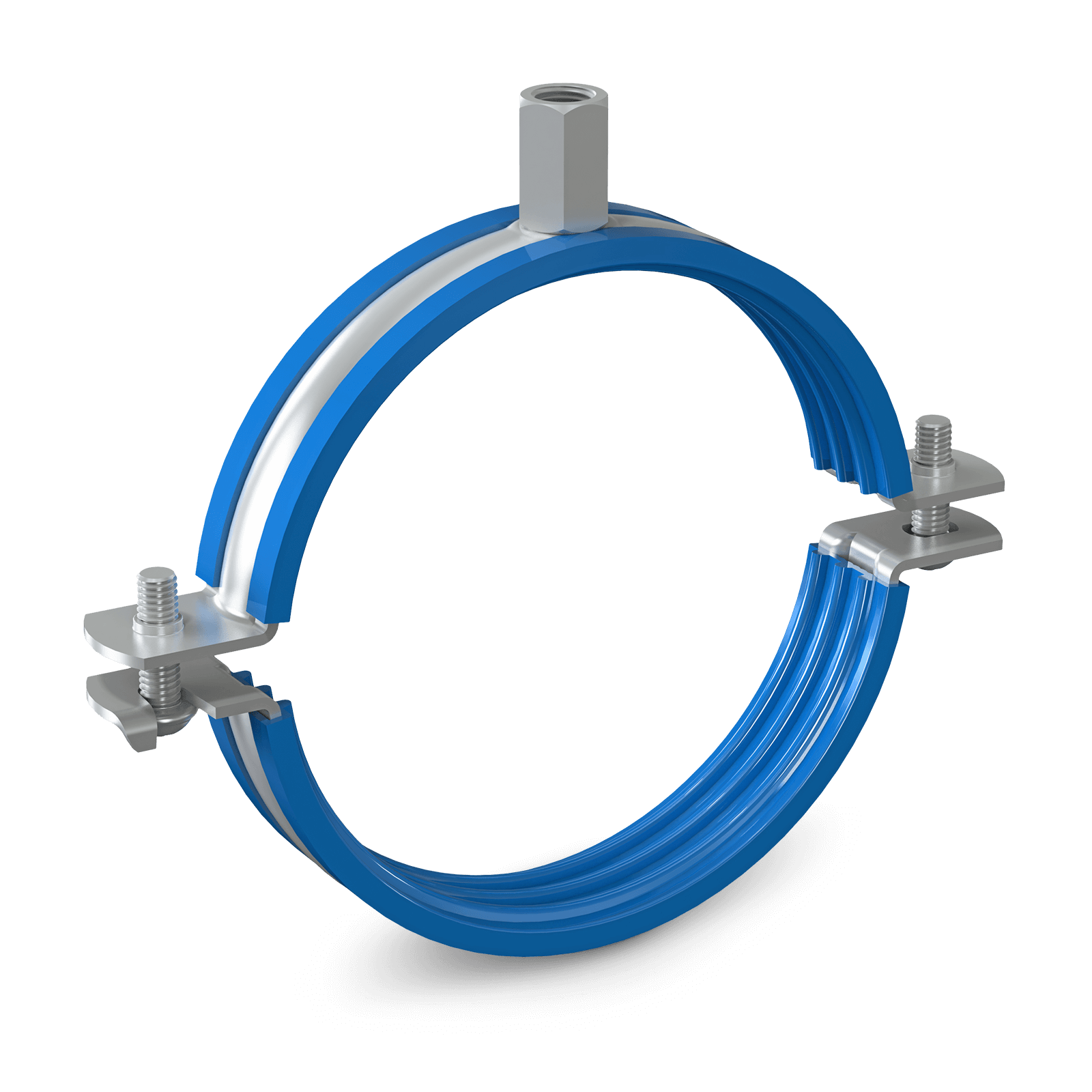 Obejma z uszczelką zapobiega przenoszeniu drgań z instalacji na konstrukcję budynku.