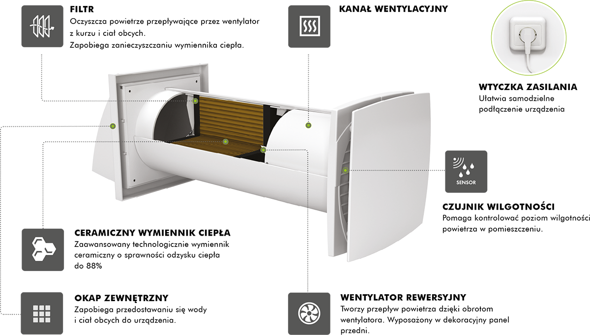 - Efektywna, energooszczędna stała wentylacja pojedynczych pomieszczeń, przy jednoczesnej minimalizacji strat ciepła.