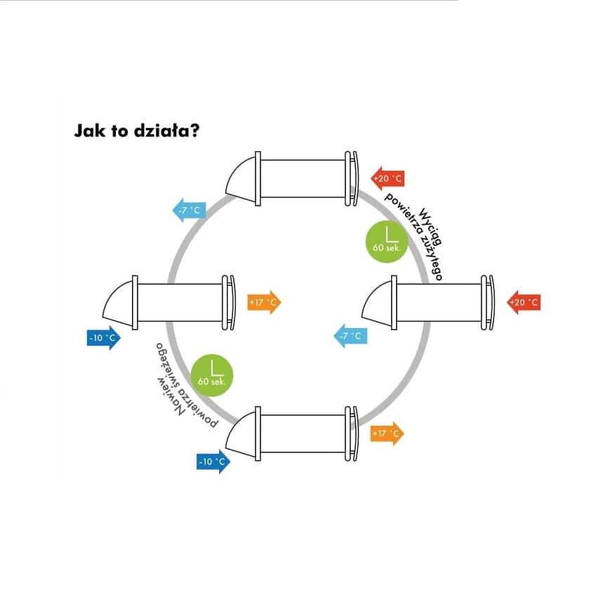 - II cykl Świeże, chłodne powietrze z zewnątrz przepływa przez wymiennik ciepła. Powietrze jest nawilżane i ogrzewane przez ciepło zgromadzone wcześniej w wymienniku. Po 60 sekundach, wentylator przełącza się ponownie w tryb wywiewny i cykl się powtarza.