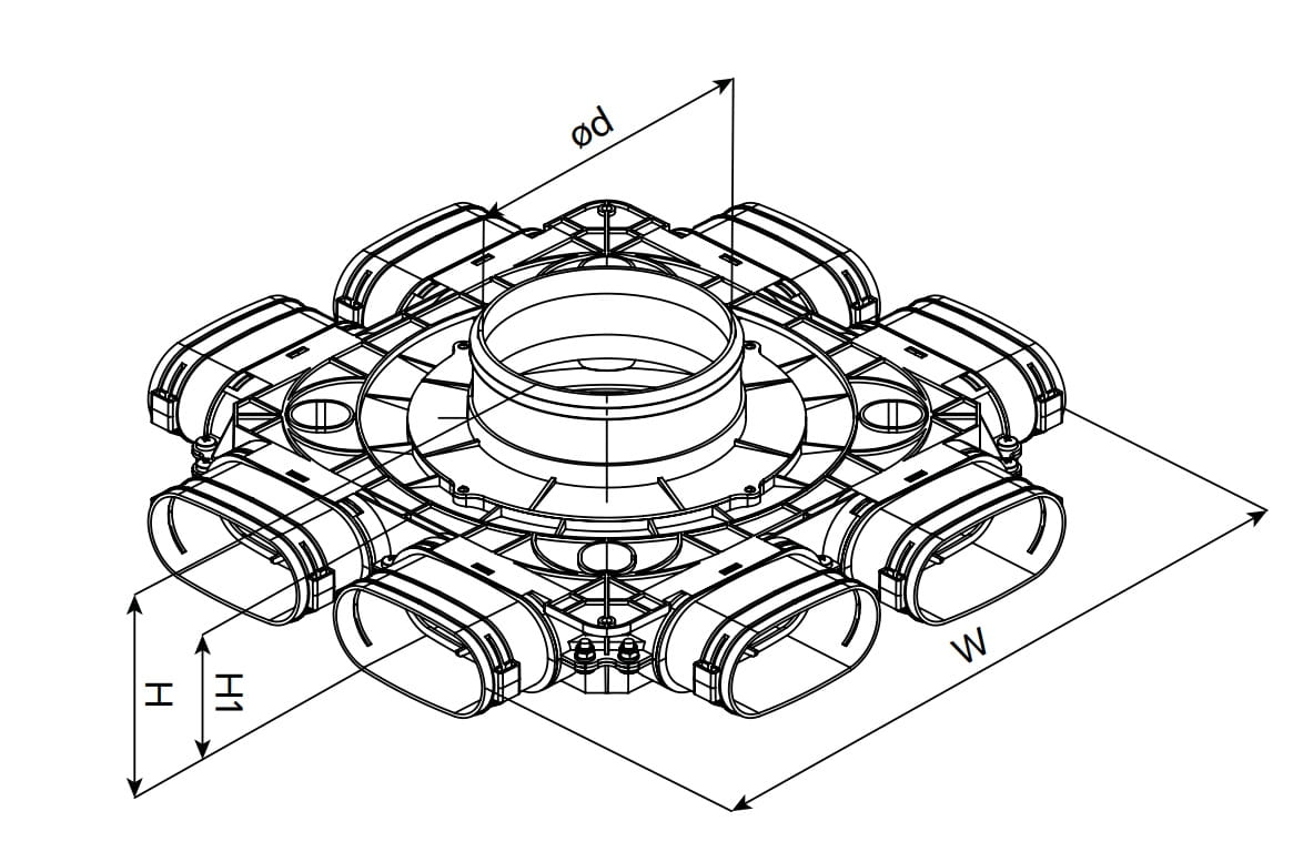 Rozdzielacz do systemu owalnego 8-króćcowego 57/117 Fi 200 Flexivent VENTS to kluczowy element umożliwiający skuteczną i równomierną dystrybucję powietrza w ramach systemu wentylacyjnego. Zaprojektowany z myślą o zapewnieniu optymalnej wydajności rekuperacji, ten rozdzielacz oferuje niezawodność oraz doskonałą jakość wykonania.