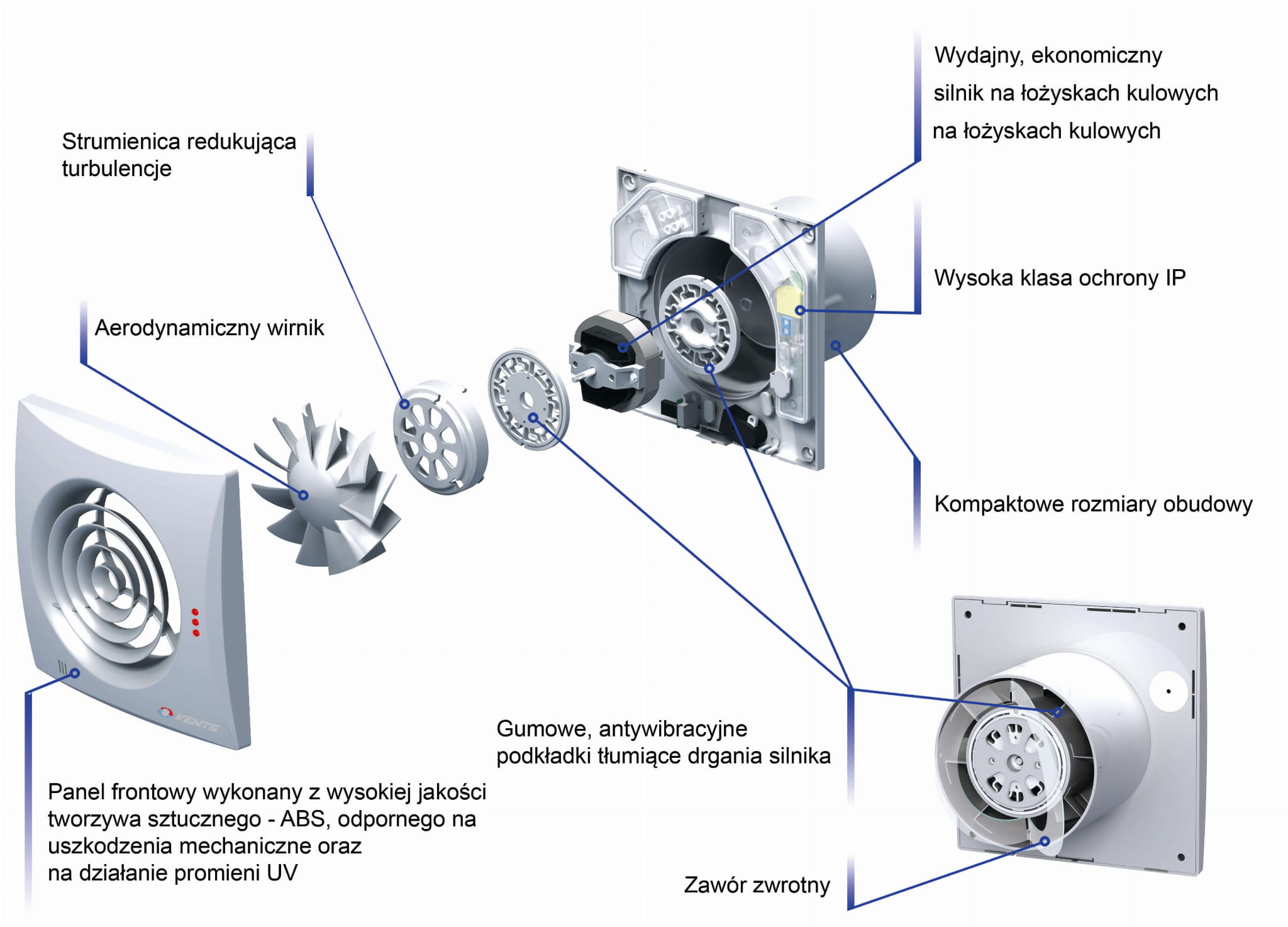 - Innowacyjny wentylator wywiewny o stylowym designie pozwalający na osiągniecie nowej komfortowej jakości regulacji mikroklimatu w łazienkach, kuchniach i innych pomieszczeniach użytkowych.